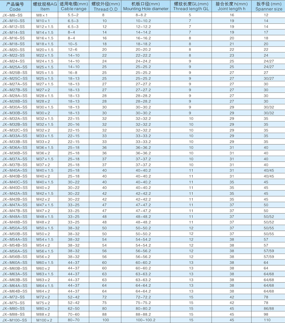 | JX-SS08 | M22*1.5 | 14-10 | 22 | 22-22.2 | 15 | 23 | 24 | 100 |